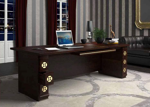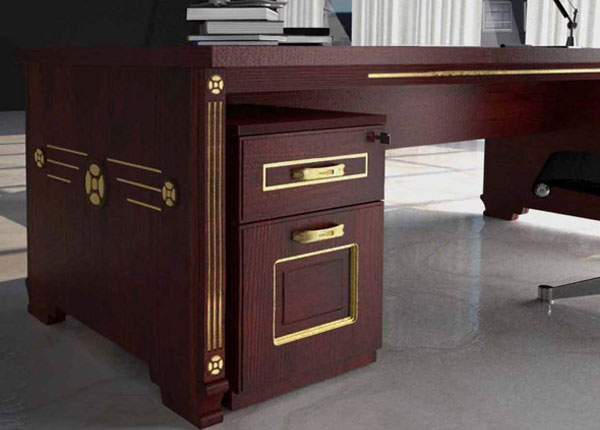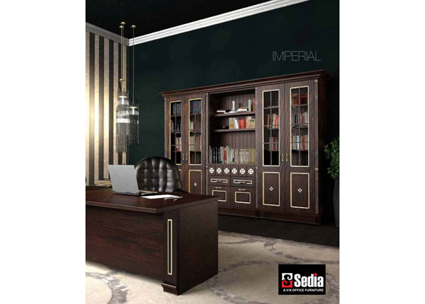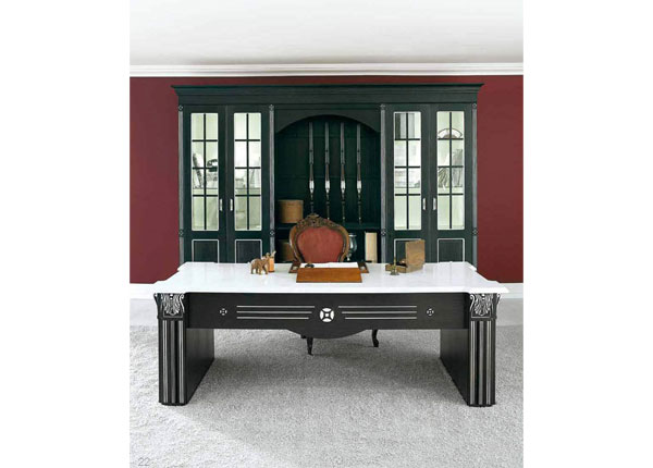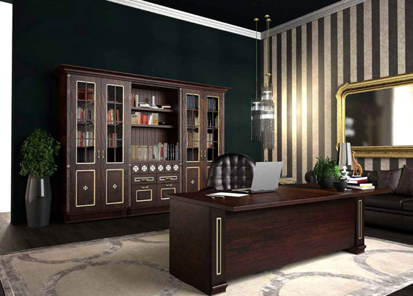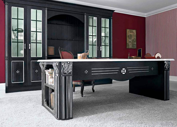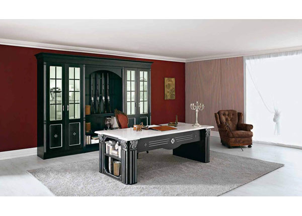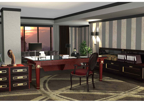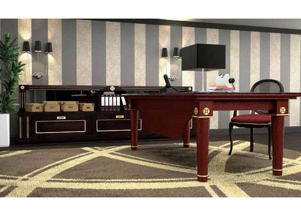 Office Desks > ImperialImperial is the synthesis of passion, tradition and design where a natural element as the stone meets craft decorations. Every element is thought as a unique piece. Materials and finishes recall old surfaces to touch, smooth and velvety, proposed in a modern style. Every single ornament is a handmade work that follows an imperial style.DOOR The profile is defined by the outdoor foulding and the stair shaped cornice placed internally; the central panel in relief shows up the cornice depth. The contrast of the stepped profile is exalted with the application of decoration in gold and silver. GLASS DOOR Tempered and transparent ancient Gothic glass; there is the Gothic decor version where the glass is hand-made decorated with gold/silver transparent effect. STUCTURE – CARCASE 18 mm thick v 70 water resistant melamine. View Catalogue |