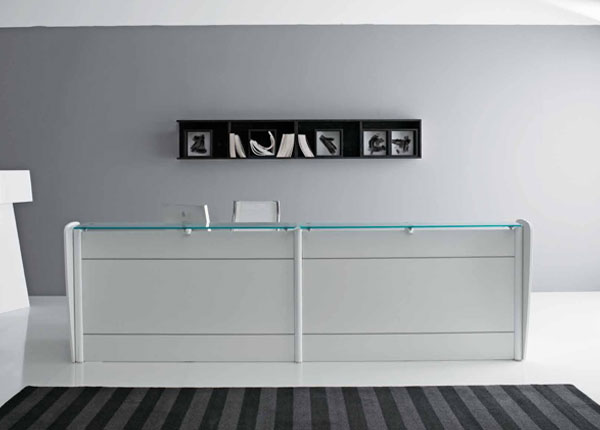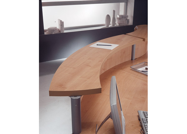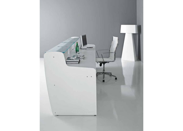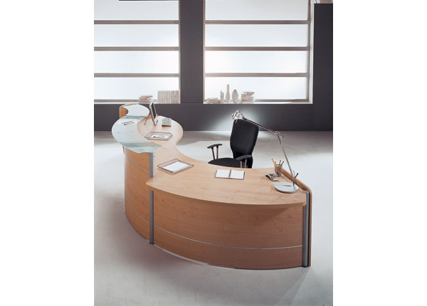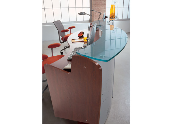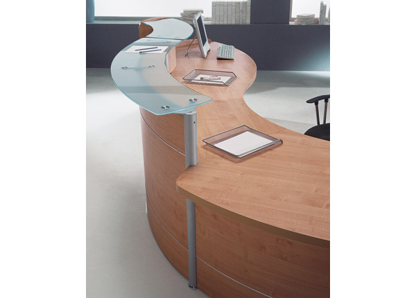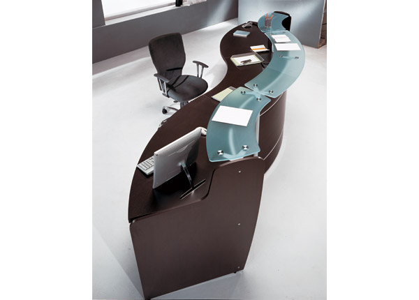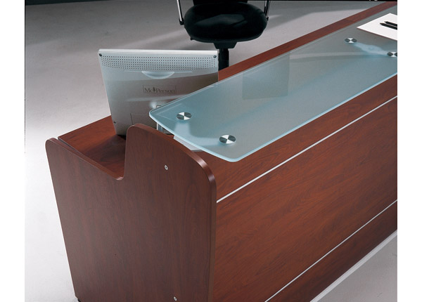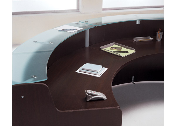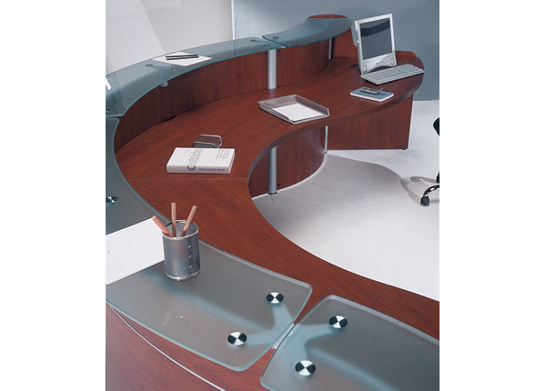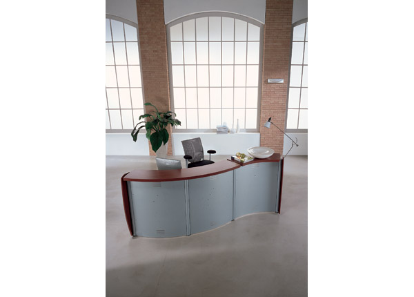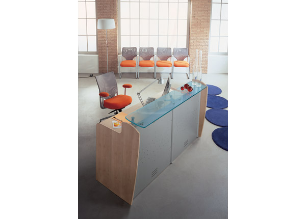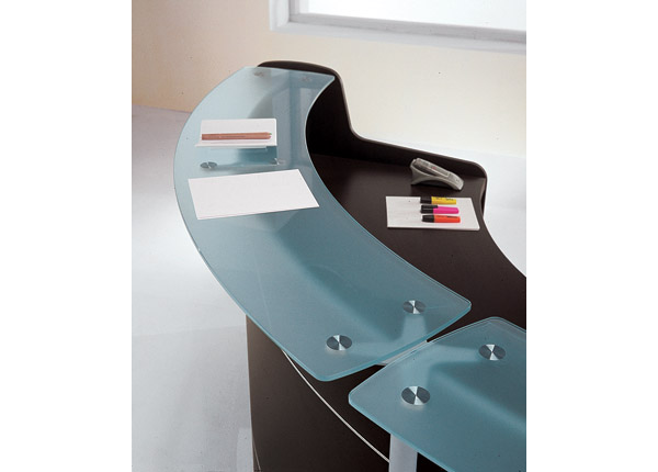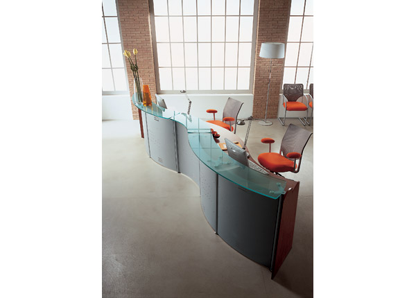 ReceptionWorktops: shaped and linear in coated board mm.38. Fronts: linear and curved with radius of 60°, in sheet steel, or in plastic laminate hpl (high pressure plastic laminate). Vertical supports: metallic tubular, diameter mm.60, with upper plate for the support of the top reception. When it is at the end, it includes a coated closure of mm.18. Top reception: linear and shaped, in 38 mm thick coated board or 12 mm thick thoughened glazed glass.View Catalogue View Catalogue Specifications |