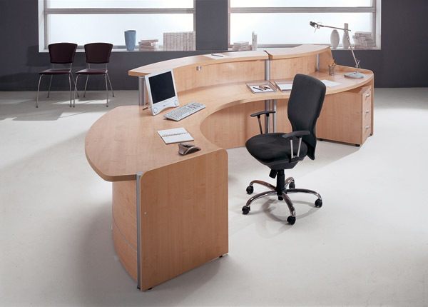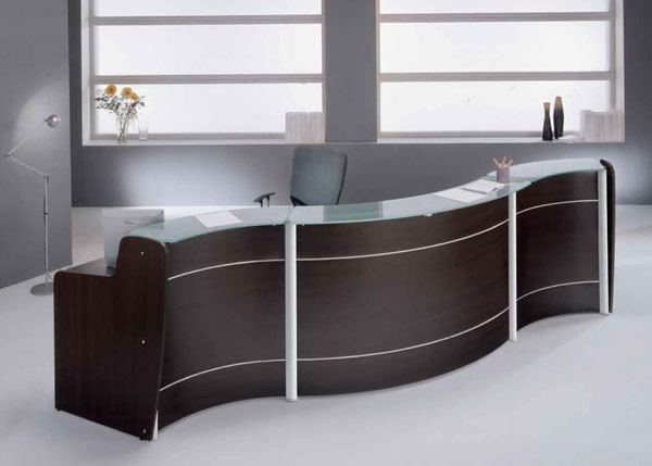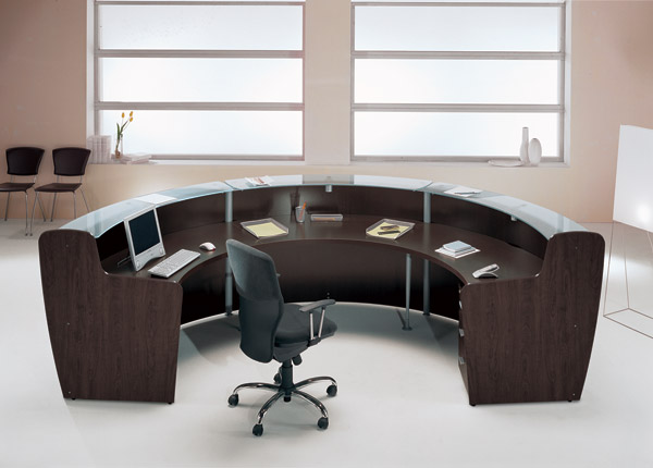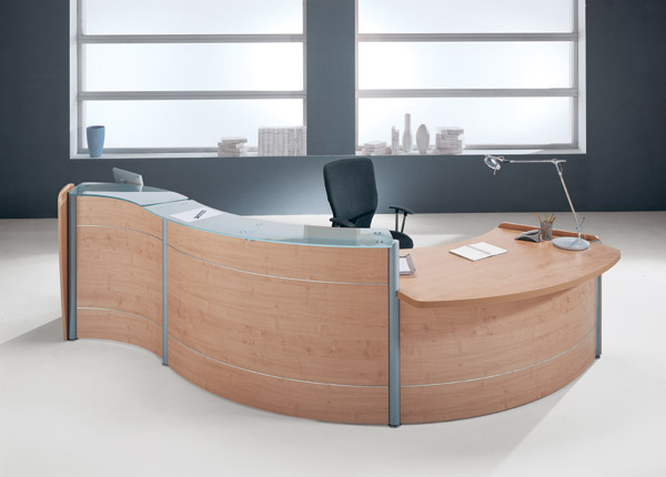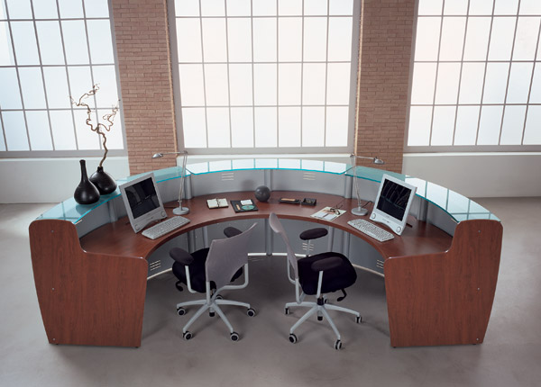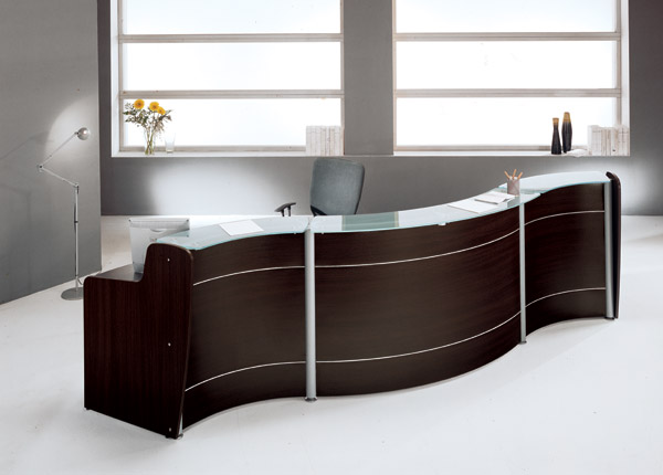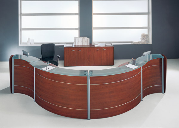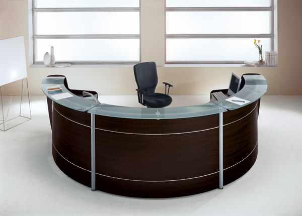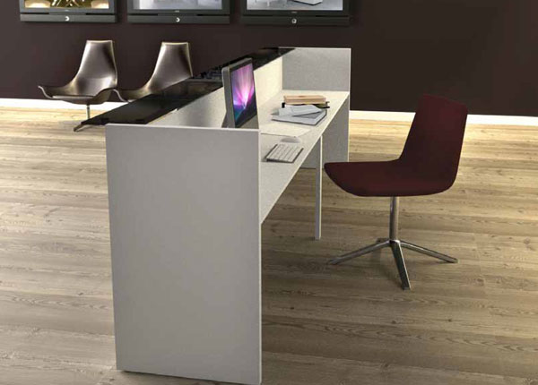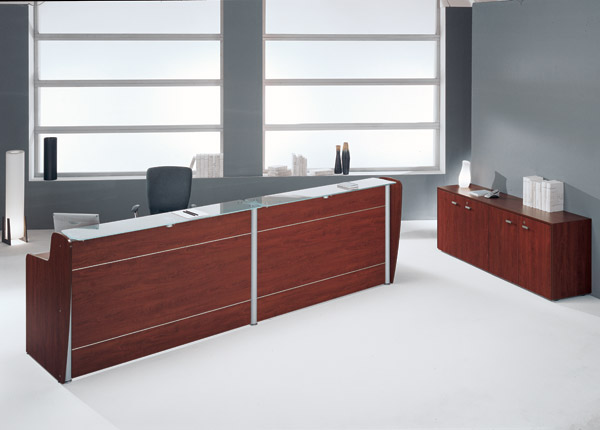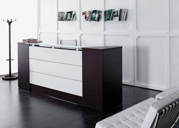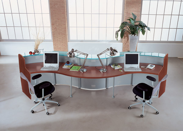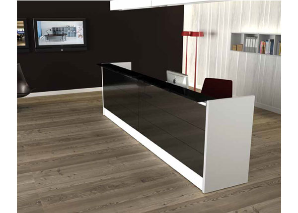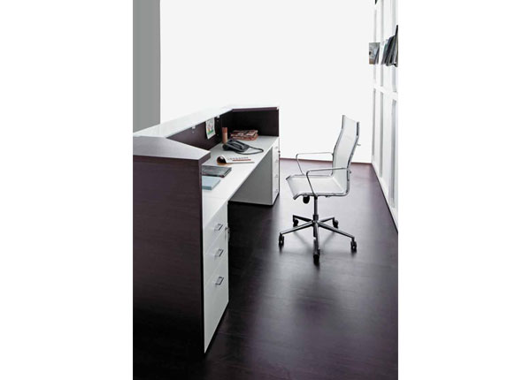 ReceptionWorktops: shaped and linear in coated board mm.38. Fronts: linear and curved with radius of 60°, in sheet steel, or in plastic laminate hpl (high pressure plastic laminate). Vertical supports: metallic tubular, diameter mm.60, with upper plate for the support of the top reception. When it is at the end, it includes a coated closure of mm.18. Top reception: linear and shaped, in 38 mm thick coated board or 12 mm thick thoughened glazed glass.View Catalogue View Catalogue Specifications |